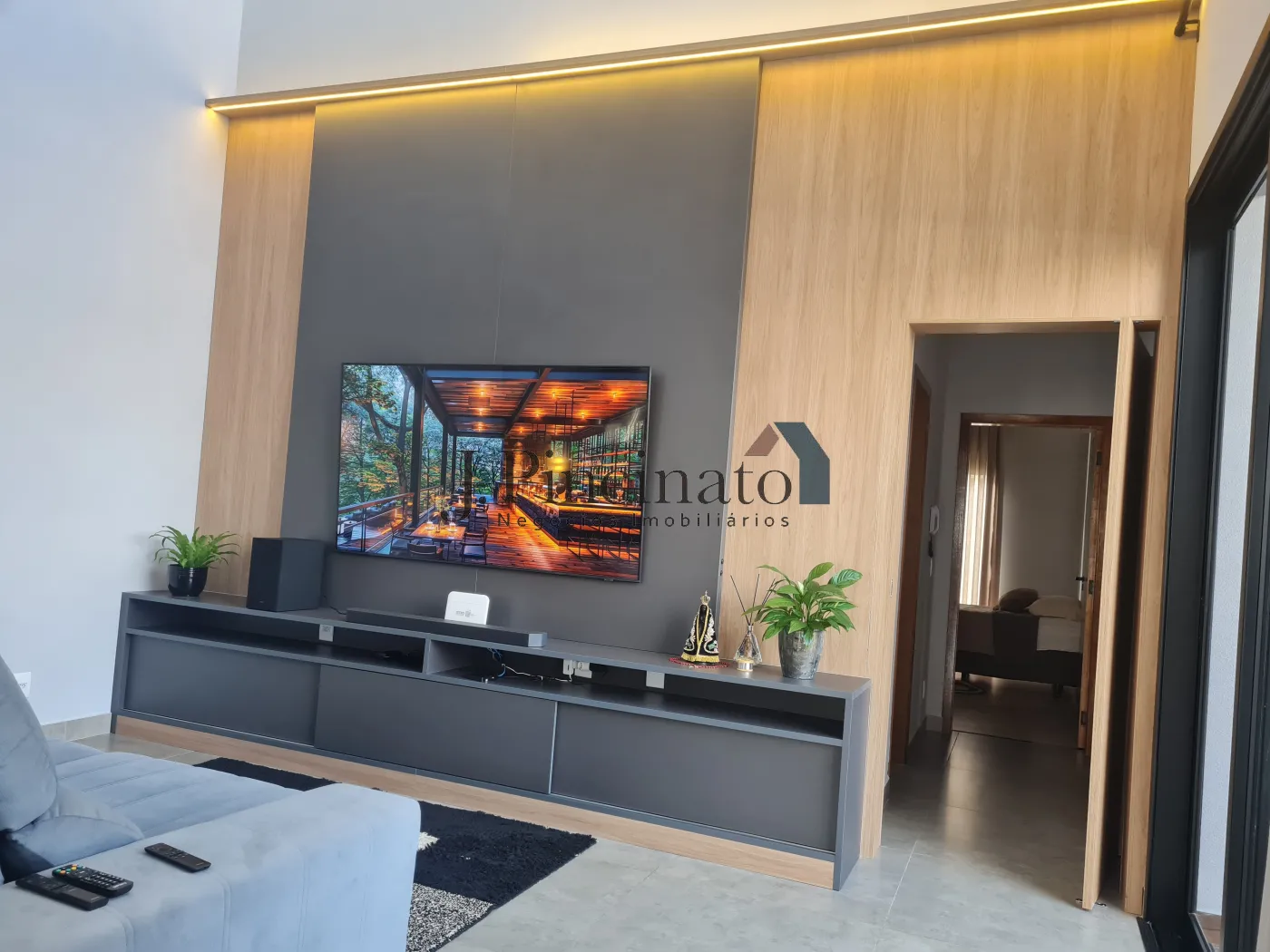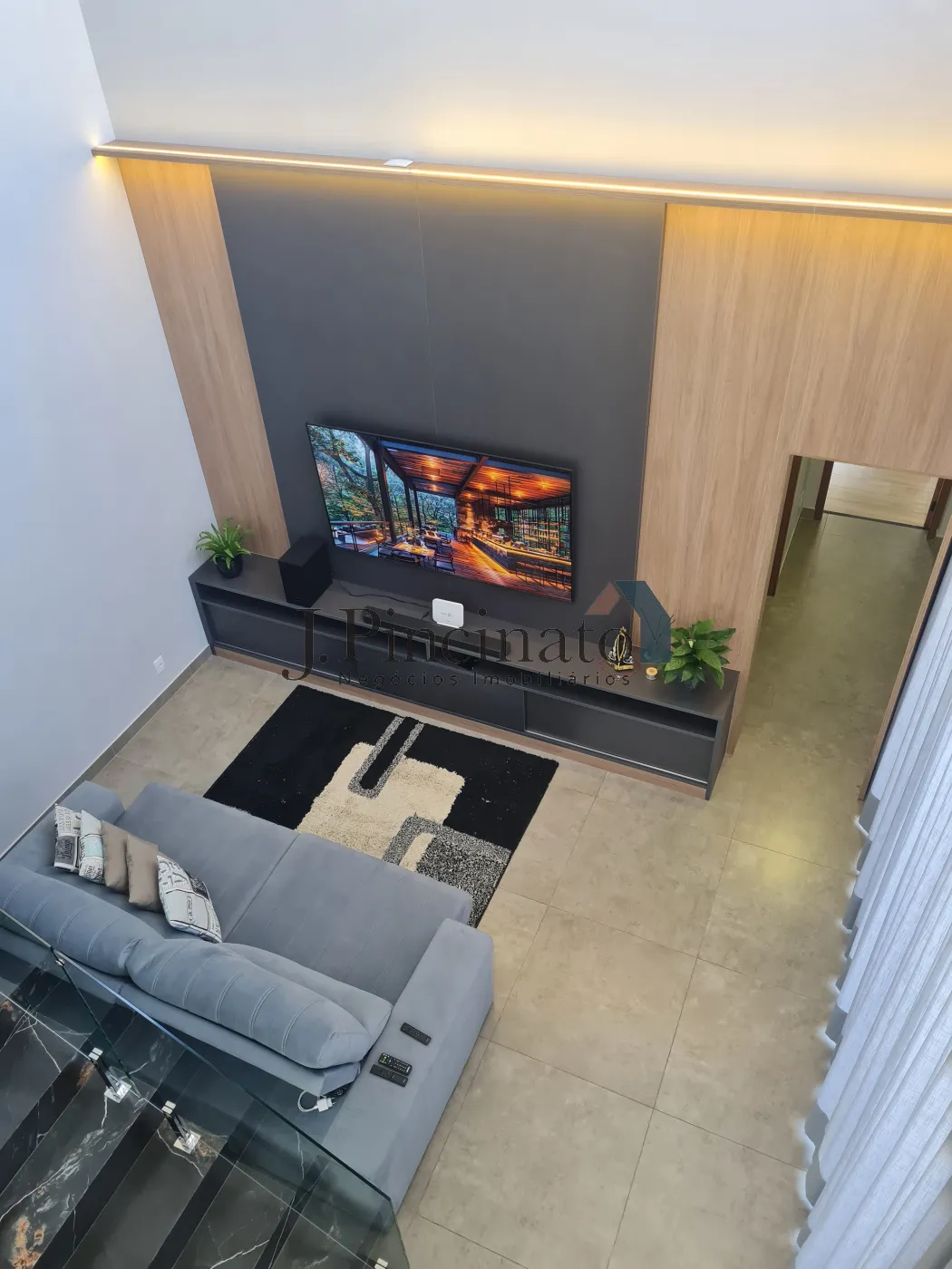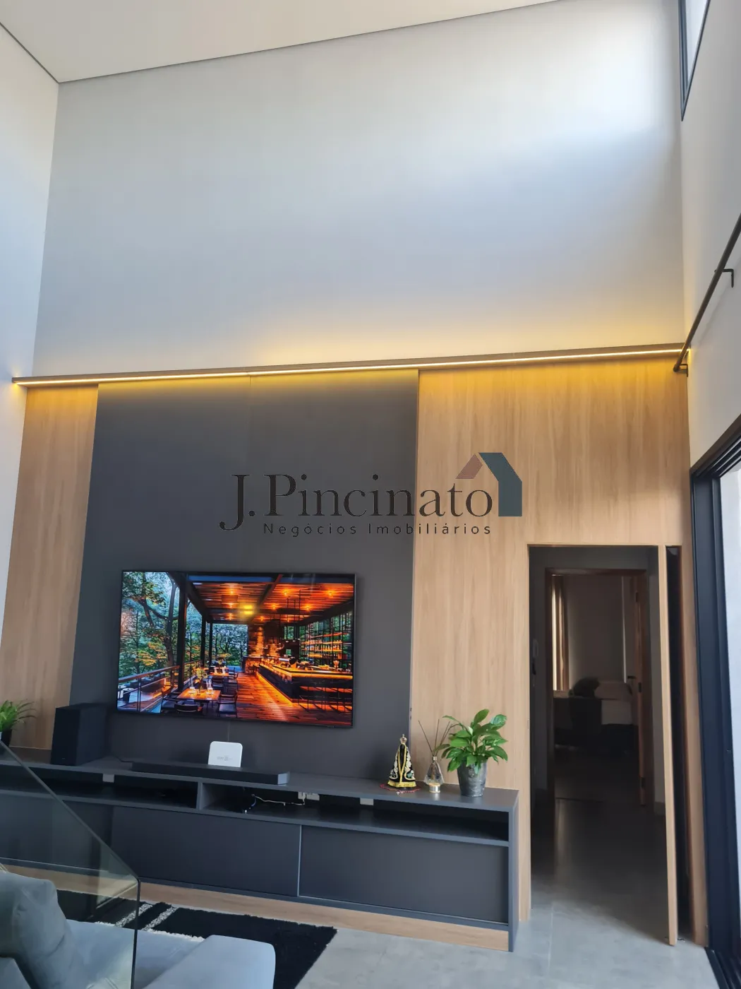 – Living com pé direito duplo, com painel de madeira com iluminação em LED e rack;