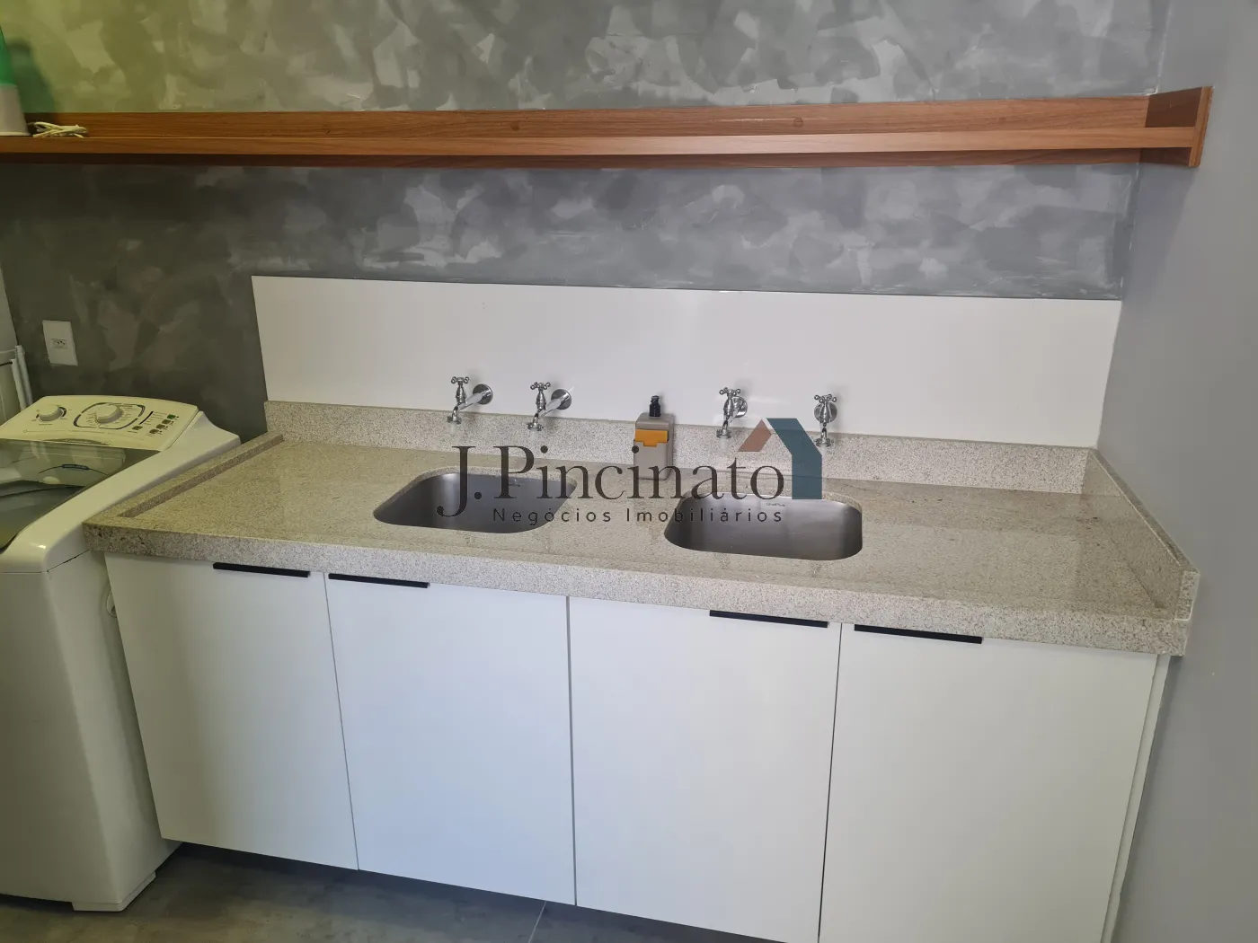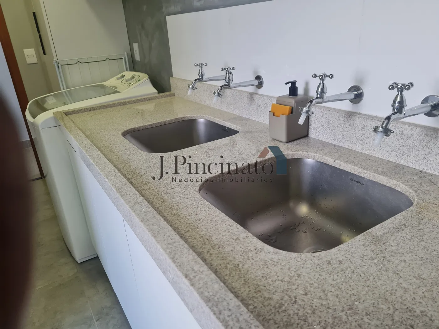– Área de serviços equipada com 02 tanques com pedra de granito claro;