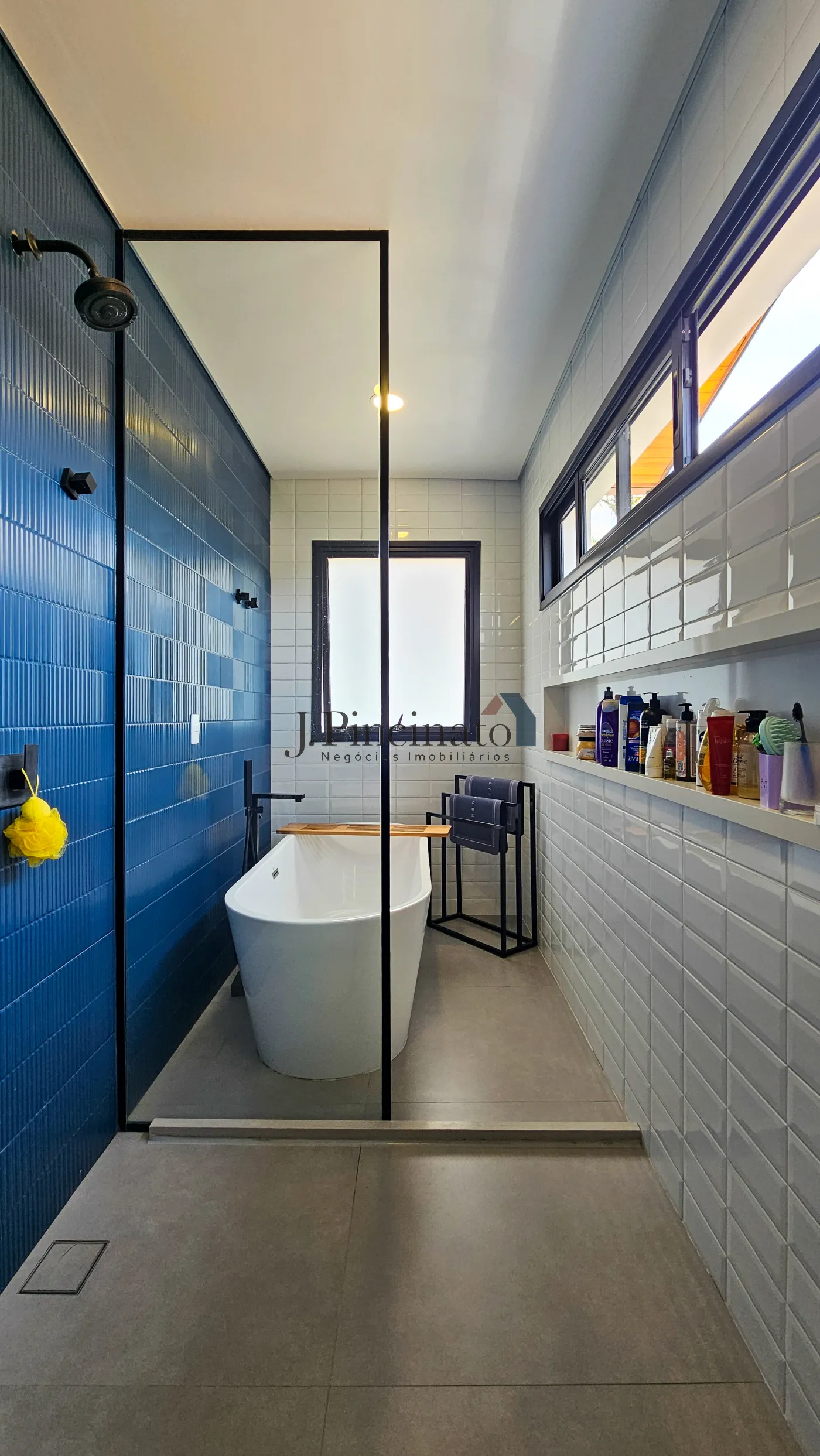 – 3 suítes, sendo uma máster com pé direito alto, 2 closet`s, chuveiro duplo e banheira de imersão;