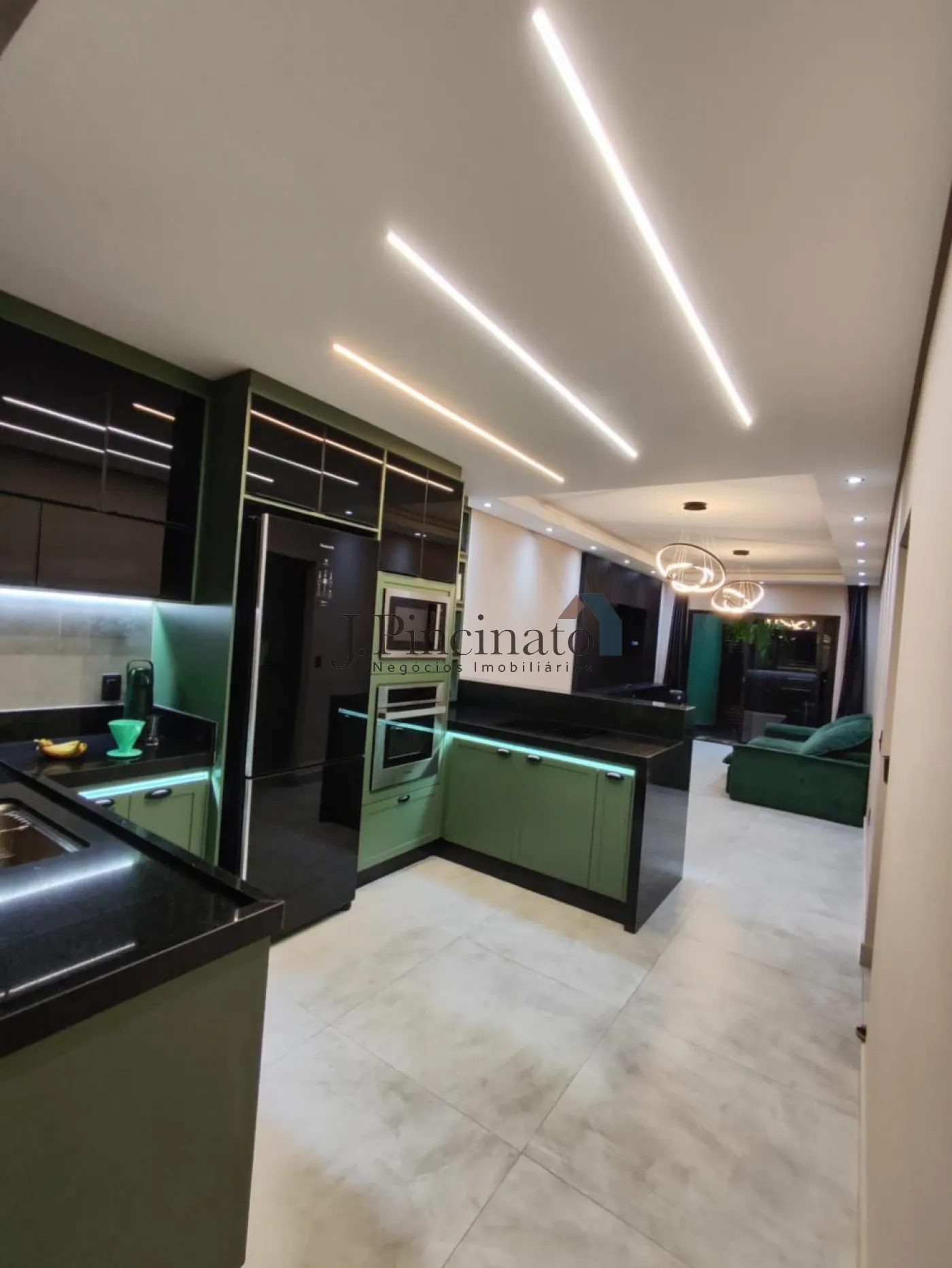 – Cozinha com geladeira, fogão com indução, microondas, forno elétrico, detalhes aço inox na cor preta,