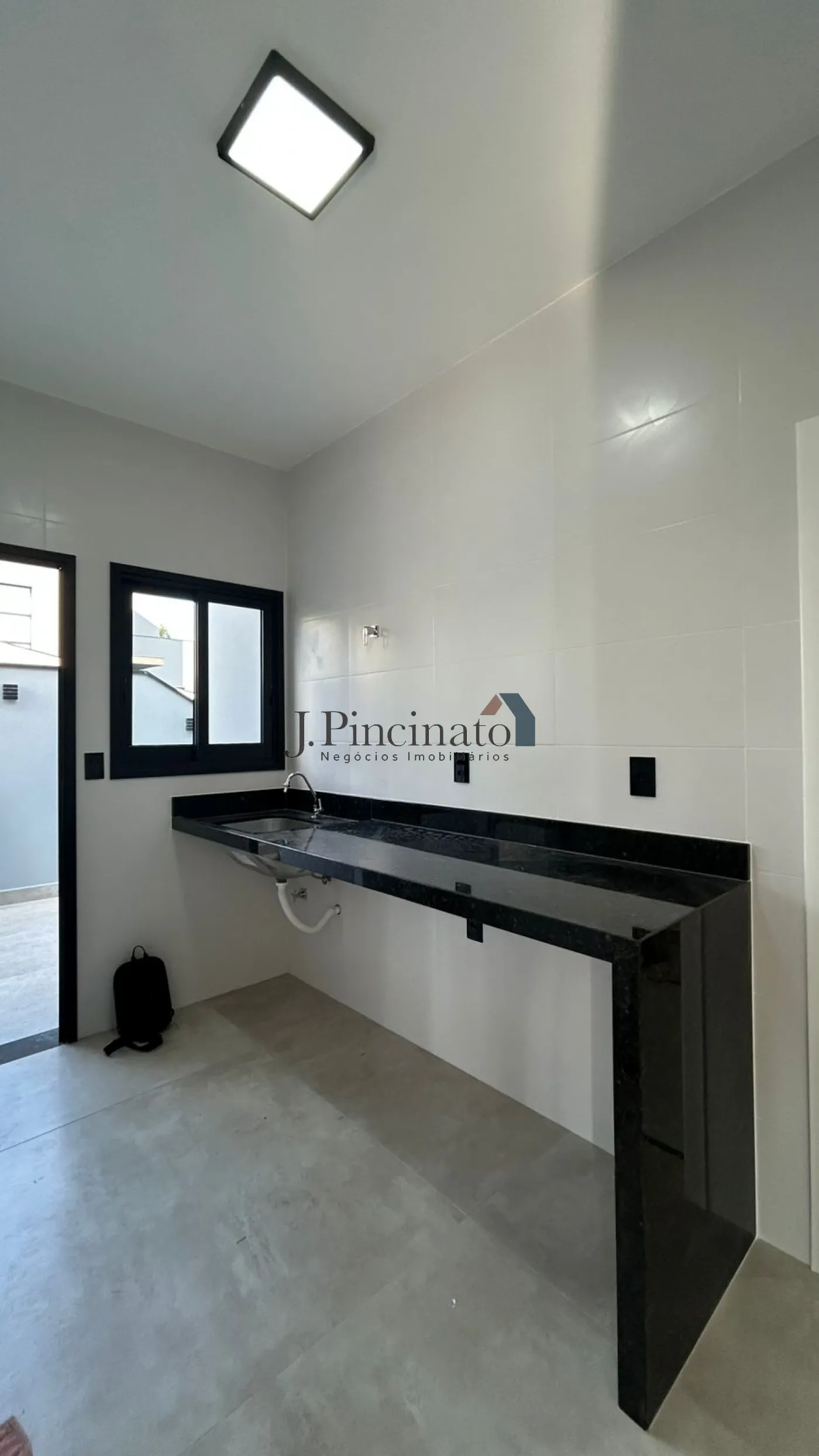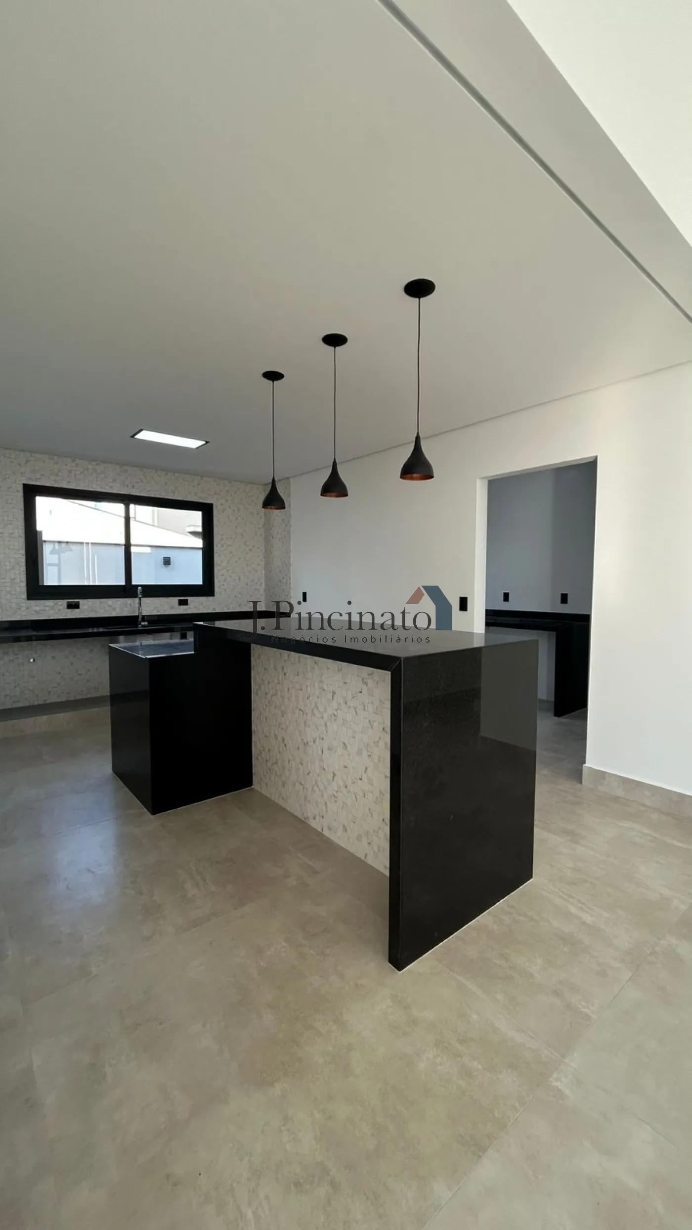 Casa com esquadrias pretas, forro em gesso, persianas automatizadas e piso porcelanato nas salas e cozinha.
